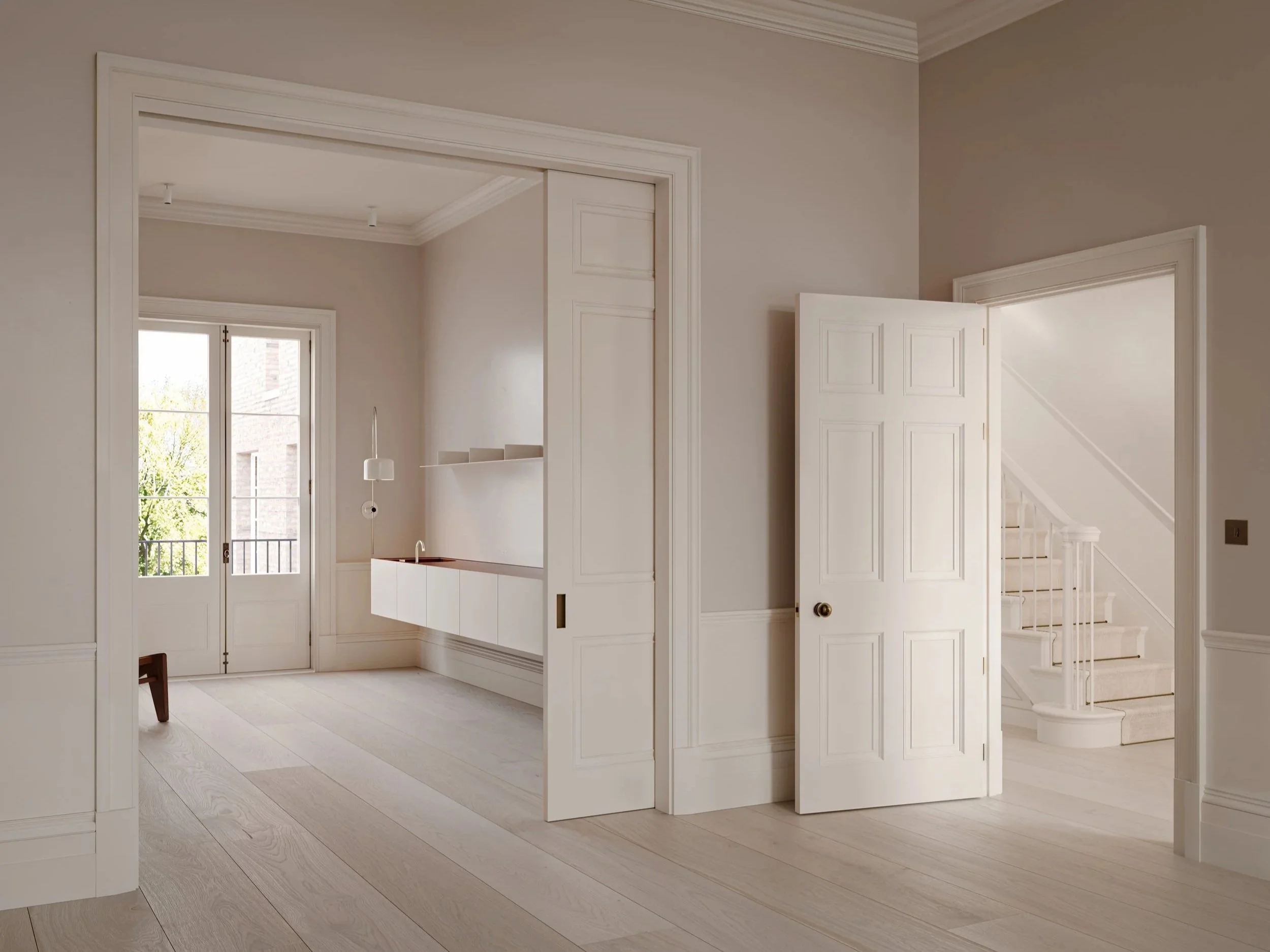 Our idea is to transform and celebrate the renewal of a once-tired dwelling into a bright, serene, and inviting home. We aim to emphasise both functionality and tranquillity through a cohesive approach to materials and layout. Our goal is to harmonise functionality with aesthetic period elegance, unified by a light, airy colour palette that enhances the sense of calm and openness.